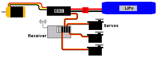 Receivers have an array of pins where servo plugs may be connected. The ESC is usually connected to channel 3 and supplies the power to the receiver and the other servos. Shortwave receivers have a long antenna wire and a socket where you must plug in a receiver crystal for it to work. For best reception, this antenna wire should be completely unwound. It normally runs the length of the fuselage and out the back of the aircraft.