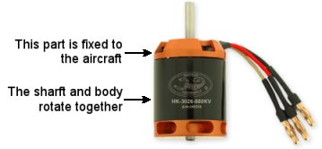 Brushless motors are often known as "outrunner" motors because most of the motor casing rotates around the commutator coil. Only one end of the motor remains stationary (see picture right), and this end is connected to the aircraft frame. Brushless motors have 3 connecting wires and must be controlled by a "brushless" speed controller.