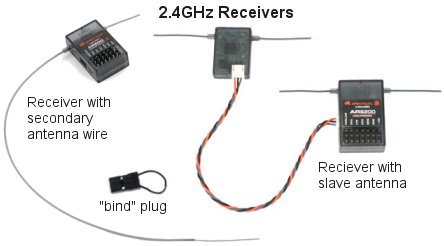 Microwave (2.4GHz) receivers do not require a crystal and have much shorter antennas (two). To assist reception, there will be either an extra-long second antenna wire or a complete secondary antenna (with both antenna wires). It is advisable to orient the secondary (antenna or wire) at 90-degrees to the first for best reception.